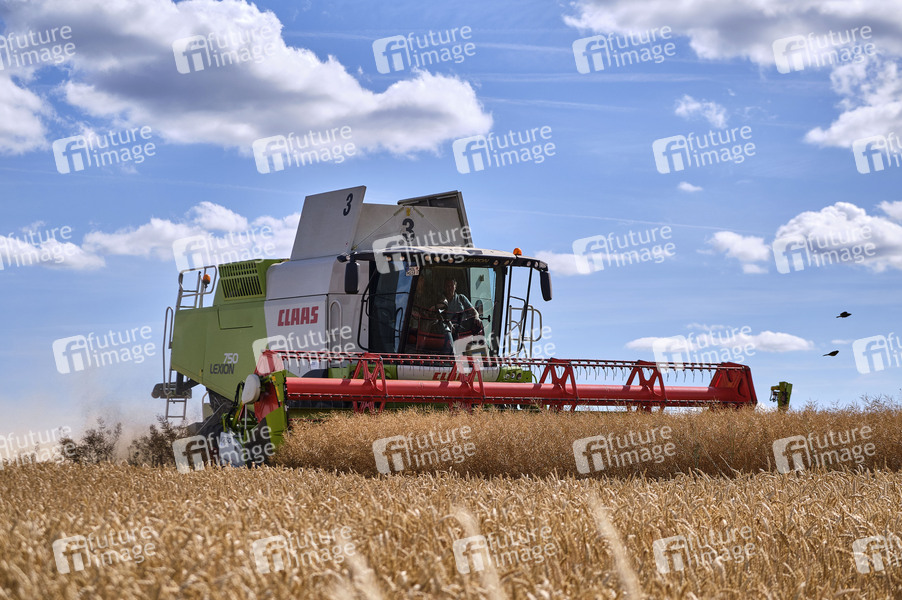 Claas Lexion 750, Erntemaschine, Frontsichelmäher, Nutzfahrzeug, Präzisionslandwirtschaft, Landwirtschaft, Ackerbau, Raps, Halme, Feld, Landwirtschaft, Dürre, Trockenheit, Wasser, Regen, Grundwasser, Wasserknappheit, Grundwasserspiegel, Grundwasserpegel, Trockenphase, Ernte, Ernten, Landwirte, Bauern, Acker, Äcker, Agrar, Agrarwirtschaft, Erntewetter, Ernteausfall, Ernteausfälle, Futterkrise, Missernte, Futter, Saat, Saatgut, Anbau, Fruchtbarkeit, Bauern, Bauernverband, Anbau, Bio, Dünger, Symbolbild, Symbolfoto