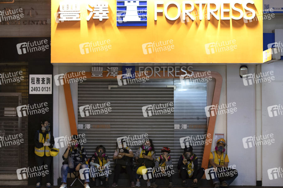 Die Freiwilligengruppe 'Protect Children' ruht sich vor dem vorzeitig geschlossenen Laden im Bezirk Tsuen Wan aus. Sonntagskämpfe zwischen Demonstranten und Polizei finden in und um Einkaufszentren in verschiedenen Stadtteilen statt. Es ist der fünfte Monat in Folge, seitdem in Hongkong die Proteste andauern, die durch ein nun zurückgezogenes Auslieferungsgesetz ausgelöst wurden. Dieser Protest hat sich jedoch zu einer breiteren Forderung nach demokratischen Reformen und unabhängigen polizeilichen Ermittlungen sowie zu anderen Forderungen entwickelt. Carrie Lam erlies ein Verbot der Gesichtsbedeckung mit Wirkung zum 5. Oktober. Bürger versammeln sich in verschiedenen Einkaufszentren und Stadtteilen, um zu protestieren. Hongkong, 10.11.2019
