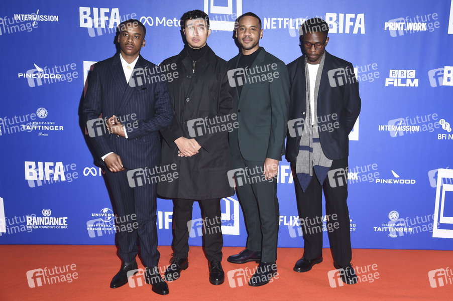 Elliot Edusah, Reda Elazour, Reggie Yates und Jordan Peters bei der Verleihung der 24. British Independent Film Awards 2021 im Old Billingsgate. London, 05.11.2021