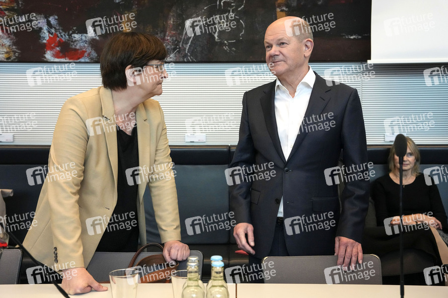 Saskia Esken und Olaf Scholz bei der Fraktionssitzung der SPD-Bundestagsfraktion im Reichstagsgebäude. Berlin, 12.03.2024