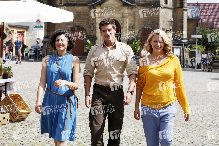 Liza Tzschirner, Philipp Danne und Eva-Maria Grein von Friedl am Set des ARD-Fernsehfilms 'Der Ranger - Paradies Heimat' auf dem Marktplatz. Stadt Wehlen, 14.08.2019