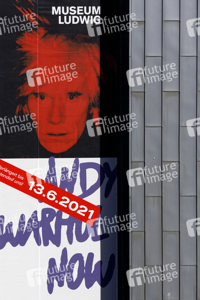 Ein Plakat für die Ausstellung 'Andy Warhol Now' am Museum Ludwig zeigt ein großes Selbstportrait von Andy Warhol. Das Museum zeigt noch bis zum 13. Juni 2021 über hundert seiner Werke, welche die Bedeutung seines Migrationshintergrunds und seiner Homosexualität neu betrachten. Aufgrund der Corona-Auflagen kann die Ausstellung nur per Timeslot-Ticket besucht werden. Köln, 29.03.2021