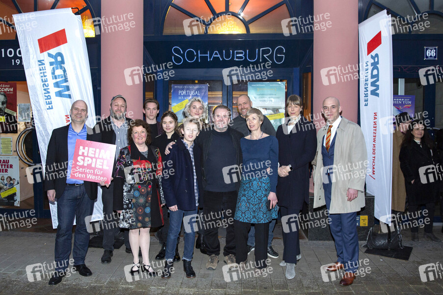 lngmar Cario, Stefan Lampadius, Dagmar Sachse, Alvar Julian Goetze, Hannah Schiller, Moritz Klaus, Antonia Lingemann, Felix Vörtler, Markus Hoffmenn, Anna Stieblich, Anna Böger und Robert Dölle bei der Präsentation des neuen Primetime-Sendeplatzes 'Heimspiel - Serien für den Westen' mit den Previews der TV-Serien 'Ohne Schnitzel geht es nicht', 'Phoenixsee' und 'Meuchelbeck' im Lichtspiel- und Kunsttheater Schauburg. Dortmund, 26.03.2019