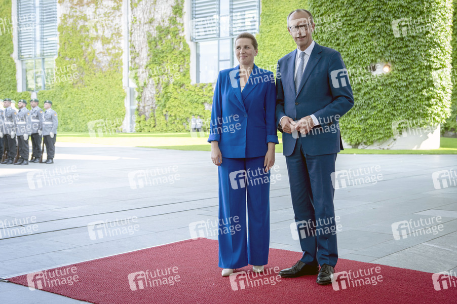 Mette Frederiksen und Friedrich Merz beim Empfang der dänischen Ministerpräsidentin mit militärischen Ehren zu einem gemeinsamen Gespräch mit anschließendem Pressestatement im Bundeskanzleramt. Berlin, 11.06.2025