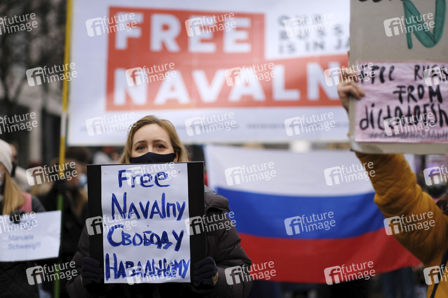 Mehrere hundert Demonstranten und Putin-Gegner fordern vor der russischen Botschaft in Berlin die Freilassung des russischen Oppositionspolitikers Alexej Nawalny / Alexei Navalny aus russischer Haft. Eine Abschlusskundgebung fand vor dem Brandenburger Tor statt. Berlin, 23.01.2021