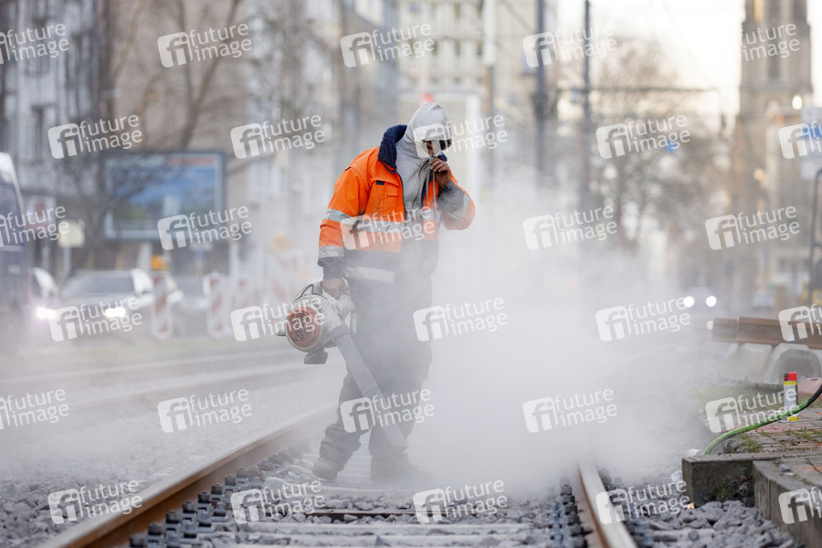 Ein Bauarbeiter bläst Betonstaub von Bahnschienen. Köln, 27.03.2020