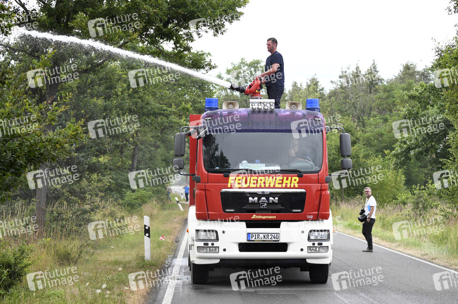 Feuerwehr im Einsatz beim Pressetermin in der Gohrischheide, wo es seit dem 1. Juli brennt. Derzeit wird von einer vom Brand betroffenen Fläche von etwa 2.100 Hektar ausgegangen. Aktuell befinden sich etwa 600 Kräfte von der Freiwilligen Feuerwehr, dem Technischen Hilfswerk, der Bundeswehr, der Polizei und anderen Organisationen in den fünf Einsatzabschnitten im Einsatz. Im Einsatzabschnitt Jacobsthal ist die Lage stabil. Es gilt weiterhin eine Ausbreitung des Brandgeschehens Richtung Süden zu verhindern sowie den alten Sprengplatz und die Ortschaft zu schützen. Jacobsthal, 07.07.2025