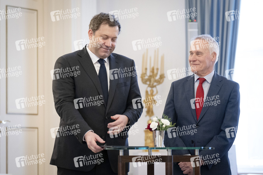 Lars Klingbeil und Achim Meyer auf der Heyde bei der Übergabe der Wohlfahrtsmarken 2026 durch den Bundesminister der Finanzen an den Bundespräsidenten im Schloss Bellevue. Berlin, 12.02.2026