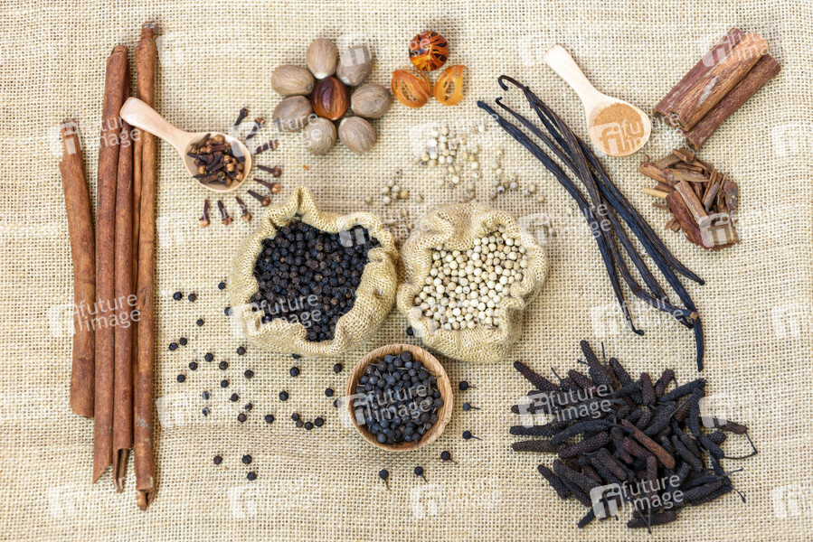 Gewürze, Gewürz, Kochen, Küche, Muskat, Muskatblüte, Zimt, Zimtkassie, Vanille, Nelken, Nelke, schwarzer Pfeffer, weißer Pfeffer, Kubeben Pfeffer, langer Pfeffer, Pfefferkörner, Piper Nigrum, Küche, Aroma, Aromatisch, Gastronomie, Indonesien, Organic, Spices, Sulawesi, Symbolbild, Symbolfoto
