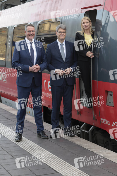 Alexander Schweitzer, Patrick Schnieder, Evelyn Palla bei der Inbetriebnahme der neuen Ahrtalbahn mit Sonderfahrt von Dernau nach Altenahr. Altenahr, 12.12.2025