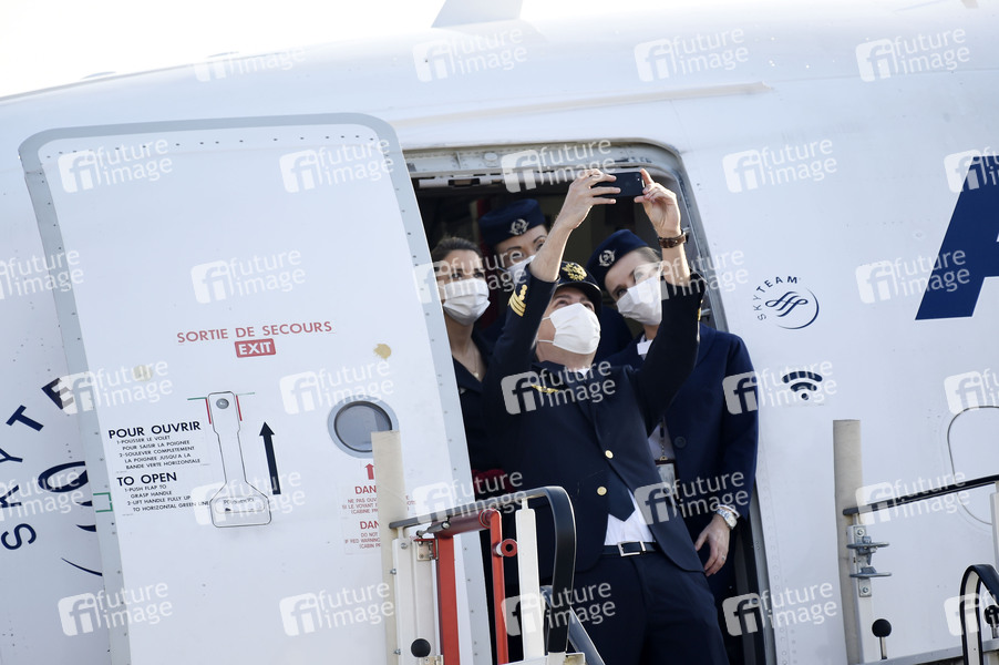 Pilot Christophe Ruch und seine Crew des letzten Air France Fluges machen Selfies. Mit der Inbetriebnahme des Flughafens Berlin Brandenburg Willy Brandt (BER) wird der gesamte Luftverkehr der Hauptstadtregion an einem Standort konzentriert. Der Flughafen Tegel, kurz TXL, schließt am 8. November. 60 Jahre nach dem ersten Linienflug von Air France wird am 8. November ein Flugzeug der französischen Airline zum allerletzten Mal von dem Flughafen im Nordosten Berlins starten und Adieu sagen. Berlin, 08.11.2020