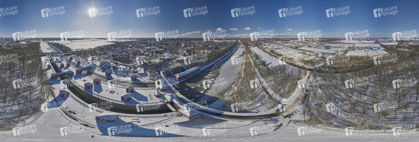 Schleuse Anderten, Wetter, verschneit, Schnee, Glätte, Eis, kalt, Wintereinbruch, Minustemperaturen, Winter, Winterwetter, Grenzwetterlage, Schneefälle, Schneefall, Frost, Wetterlage, Schiffahrt, Binnenschleuse, Kanal, Gewässer, Eisschollen, Drohne, Drohnen, Kameradrohne, Drohnenaufnahme, Panorama