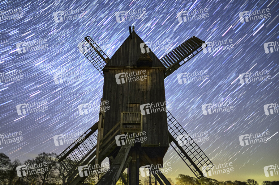 Sehenswürdigkeit, Sightseeing, Mühle, Windmühle, funktionsfähiges kulturhistorisches Denkmal, Ständermühle, Kastenmühle, Mühlenhaus, Hausbaum, technisches Bauwerk, Flügle, Windmühlenflügel, Windenergie, Energieumwandlung, Nacht, Sterne, Sternenhimmel