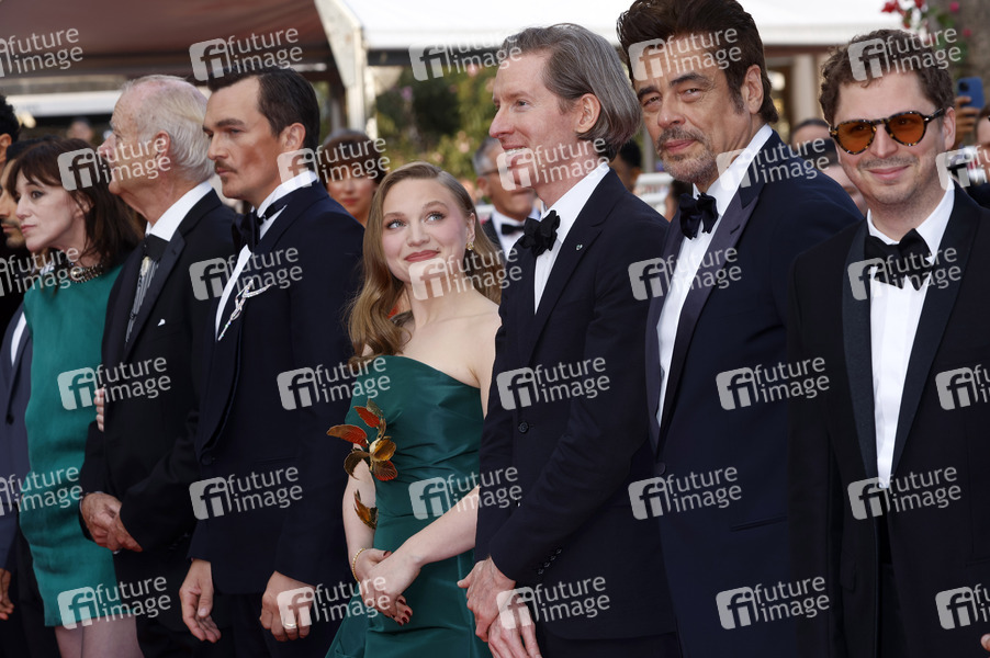 Charlotte Gainsbourg, Bill Murray, Rupert Friend, Mia Threapleton, Wes Anderson, Benicio del Toro und Michael Cera bei der Premiere des Kinofilms 'The Phoenician Scheme / Der phönizische Meisterstreich' auf dem Festival de Cannes 2025 / 78. Internationale Filmfestspiele von Cannes im Palais des Festivals. Cannes, 18.05.2025