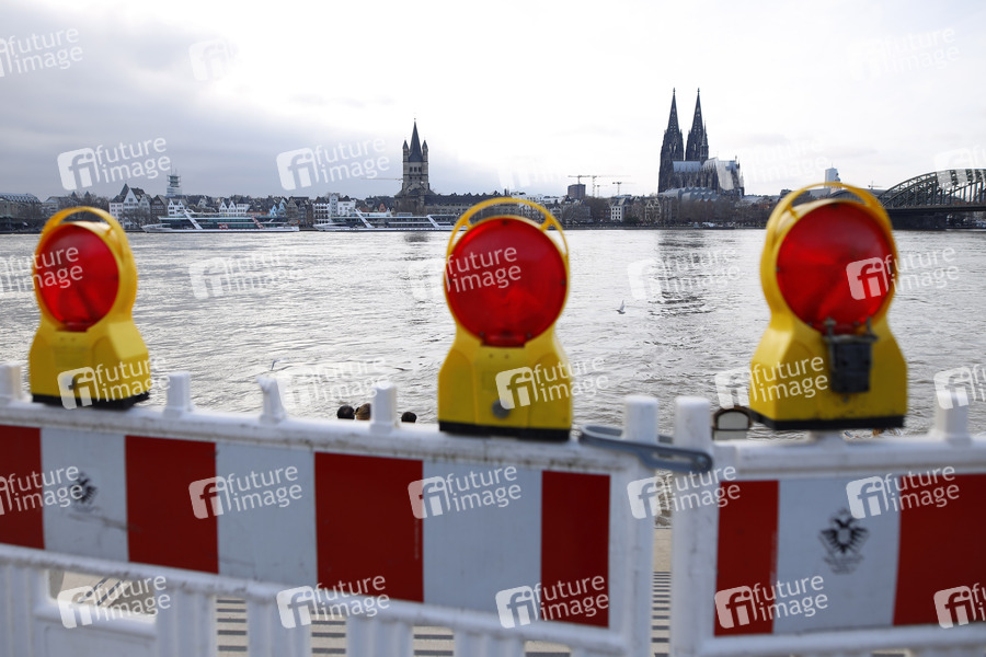 Der Kölner Rheinpegel steigt und steigt. Am Sonntagabend wurde in Köln ein Hochwasser von 7,50 Meter gemessen, der Normalwasserstand liegt sonst bei 3,21 Meter. Die Schifffahrt ist bereits eingeschränkt. Am Kölner Rheinufer werden immer mehr Barrikaden errichtet und Bereiche abgesperrt. Das Wasser klettert auf Promenaden und überspült Treppen und Fähranleger. Köln, 31.01.2021