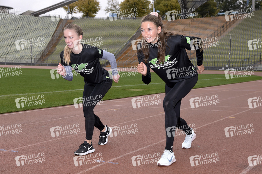 Katharina Trost und Christina Hering beim Fototermin zur sportichen '#WocheChallenge' im Olympiastation München. Unter dem Motto 'Wir können was bewegen!' ruft die Welthungerhilfe zu dieser Challenge auf und bittet um Spenden für eine Welt ohne Hunger. München, 13.10.2020