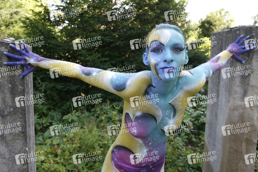 Bodypainting und Fotoshooting mit Model Sarah am Tag der offenen Tür der Meisterschule Justus-von-Liebig-Schule, Abteilung Floristik in Hannover-Ahlem. Künstler: Jörg Düsterwald