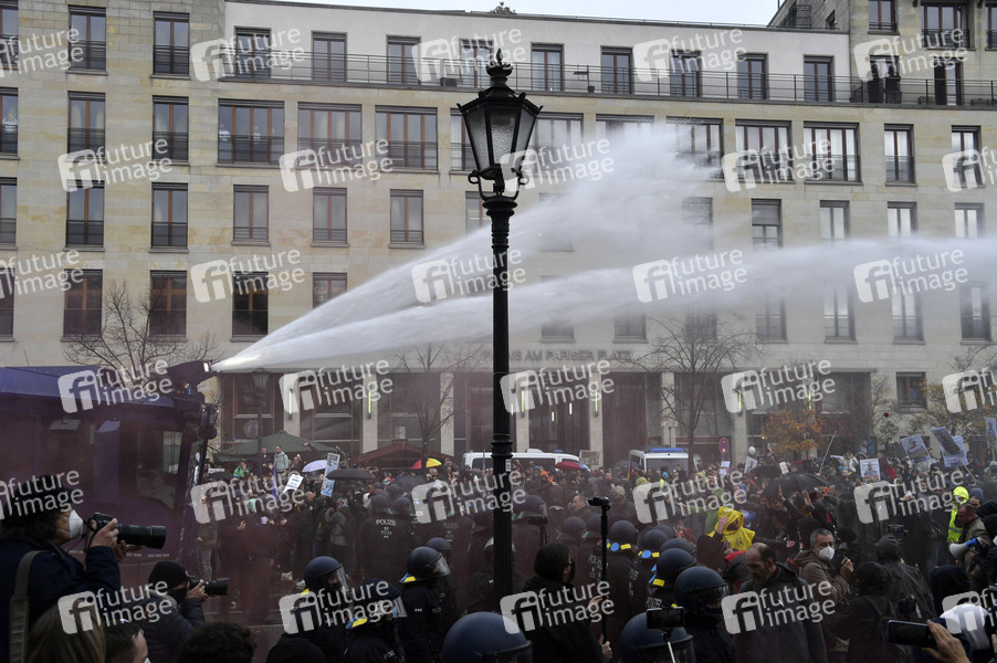 Tausende Demonstranten protestieren am Brandenburger Tor und im Regierungsviertel gegen die Corona-Politik der Regierung. Wegen der massenhaften Verstöße gegen die Hygieneauflagen hat die Polizei die Proteste unter Einsatz von Wasserwerfern beendet. Berlin, 18.11.2020