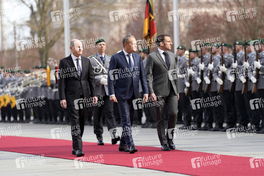 Olaf Scholz, Donald Tusk und Emmanuel Macron beim Empfang des Ministerpräsidenten von Polen und des Staatspräsidenten der Französischen Republik mit militärischen Ehren zu einem gemeinsamen Gespräch mit dem Bundeskanzler im Bundeskanzleramt. Berlin, 15.03.2024