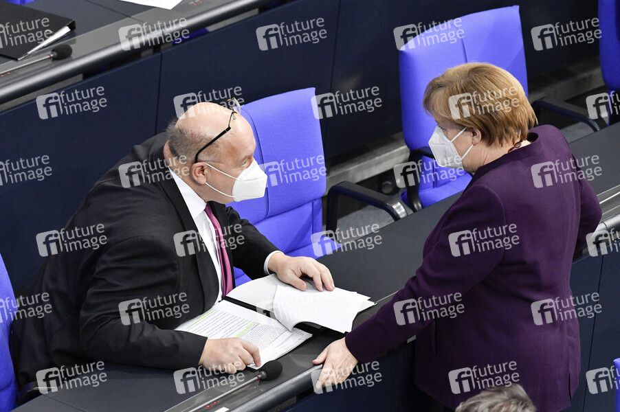 Peter Altmaier und Angela Merkel in der 205. Sitzung des Deutschen Bundestages im Reichstagsgebäude. Berlin, 27.01.2021