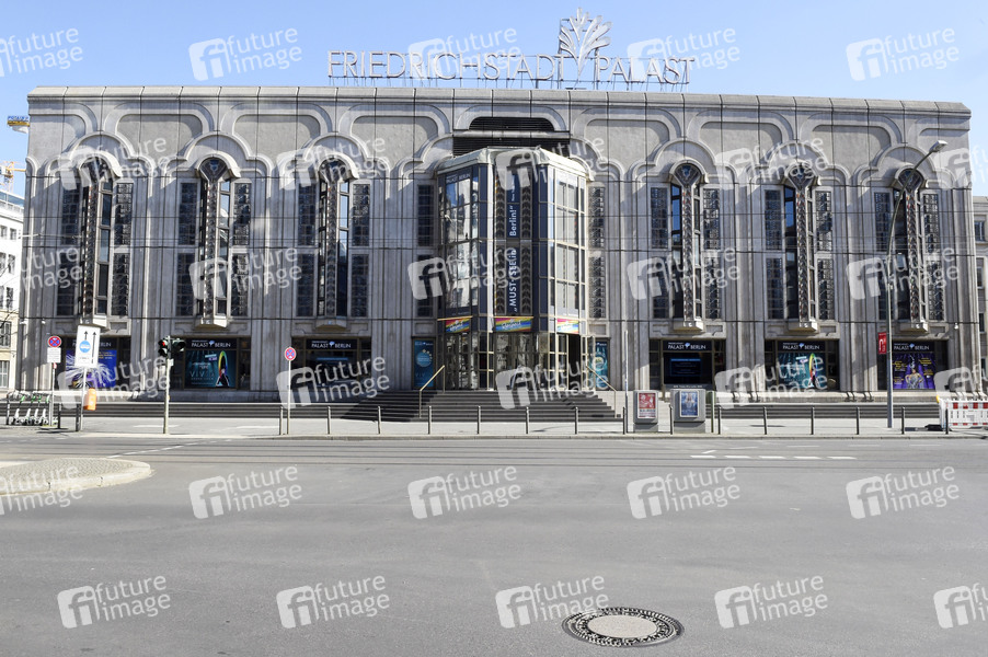 Am Samstag ist es um den Friedrichstadt-Palast menschenleer. Die Maßnahmen des Senats im Kampf gegen das Coronavirus werden ausgedehnt. Seit Freitag sind die staatlichen Theater-, Opern- und Konzerthäuser komplett geschlossen, genauso wie die Museen, Gedenkstätten und Bibliotheken. Dem Beispiel der staatlichen Kultureinrichtungen folgen auch die meisten private Bühnen. Ab kommender Woche schließen auch Schulen und Kitas. Berlin, 14.03.2020