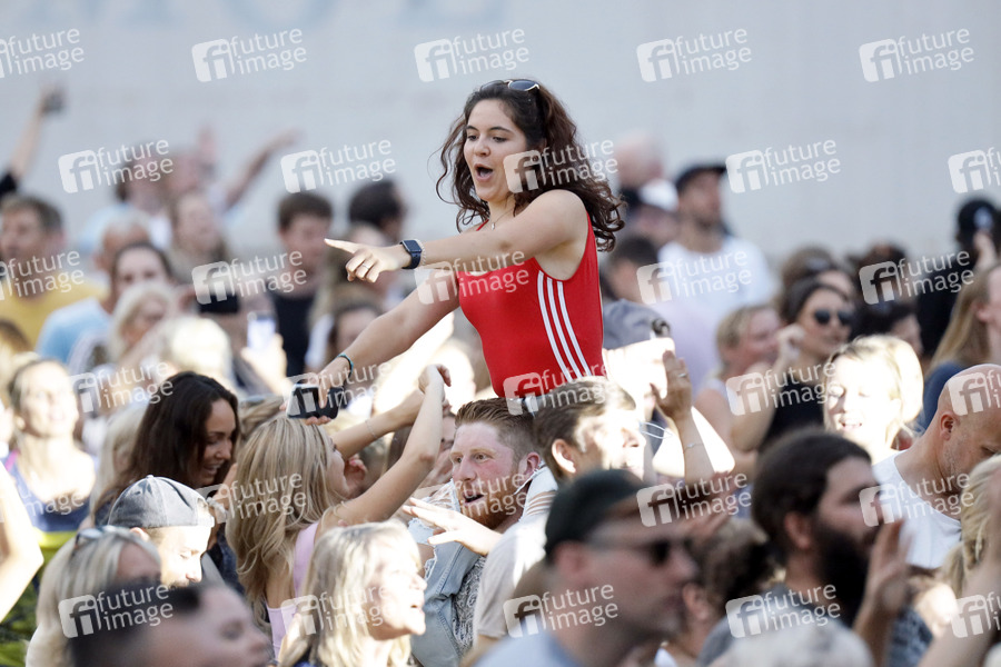 Publikum bei einem Benefizkonzert an der Südbrücke zugunsten der Opfer des Jahrhunderthochwasser in der Eifel. Auftritte und Gastronomie finden unter Corona-Auflagen wegen der Covid-19 Pandemie statt. Ab einer Inzidenz von 50 gilt in Köln wieder: Es dürfen nur 500 getestete Personen in Konzerte, Kinos und Theater innen unter Einhaltung von Mindestabstand. (Themenbild, Symbolbild) Köln, 12.08.2021