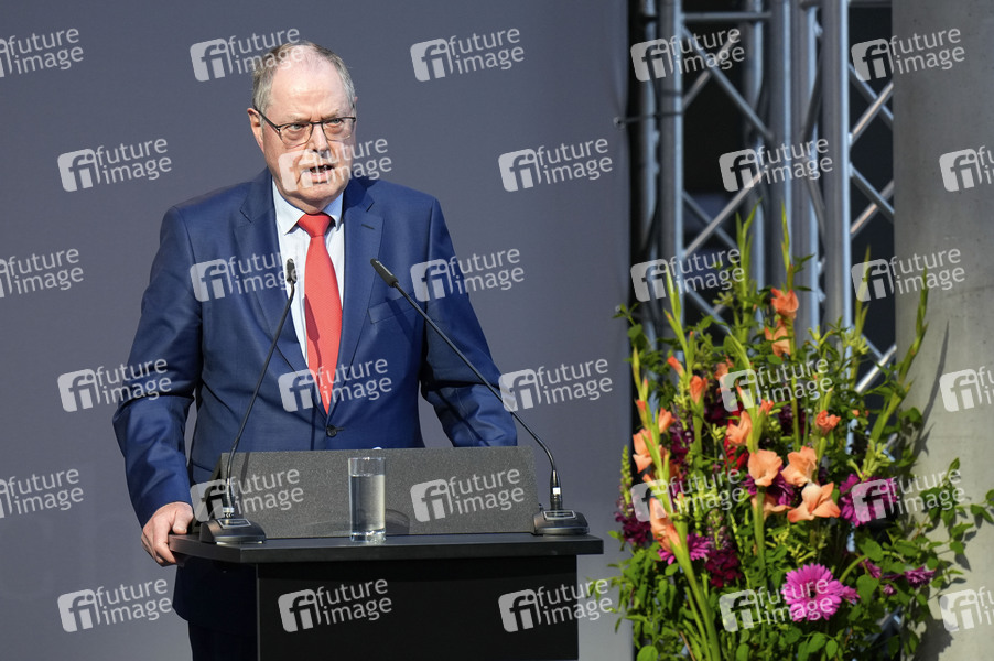 Peer Steinbrück bei der Wanderausstellung der Bundeskanzler-Helmut-Schmidt-Stiftung 'Challenging Democracy - Von Helmut Schmidt bis heute' im Paul-Löbe-Haus des Deutschen Bundestages. Berlin, 23.04.2024