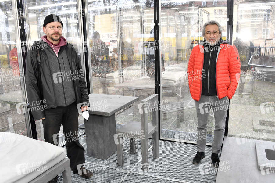 Peter Steudtner und Can Dündar bei der Pressekonferenz des KulturForum TürkeiDeutschland zur Solidarität mit den gesamten demokratischen Kräften in der Türkei, insbesondere mit inhaftierten Schriftsteller*innen, Künstler*innen, Journalist*innen, Gewerkschafter*innen und Politiker*innen vor dem Maxim Gorki Theater. Berlin, 23.03.2021