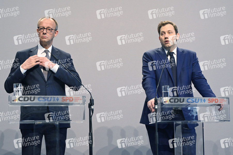 Friedrich Merz und Lars Klingbeil bei der Pressekonferenz von CDU, CSU und SPD zur Vorstellung des gemeinsamen Koalitionsvertrages im Paul-Löbe-Haus. Berlin, 09.04.2025
