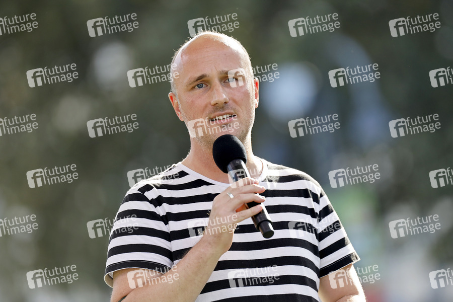 Sven Lehman redet bei einem Wahlkampf-Auftritt für die Kölner Grünen auf dem Heumarkt. Köln, 22.09.2021