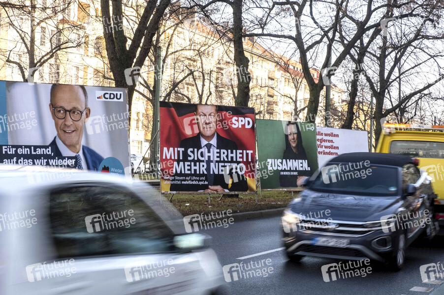 Wahlplakate verschiedener Parteien zur Bundestagswahl 2025 an der Wisbyer Straße in Berlin-Prenzlauer Berg. Berlin, 20.01.2025
