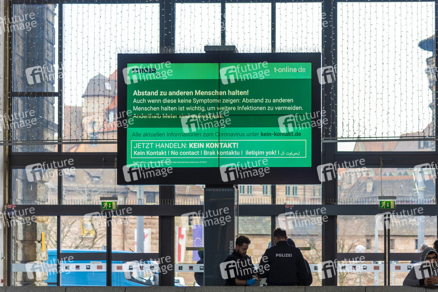 Warmhinweise am Hauptbahnhof. Maßnahmen wegen das Coronavirus. Nürnberg, 20.03.2020