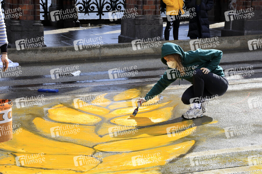 Am Freitag finden mehrere Demonstrationen zum globalen Klimastreik von Fridays for Future in Berlin statt. An der Oberbaumbrücke bemalen Aktivisten die Straße zum Thema 'Another World is possible'. Berlin, 19.03.2021