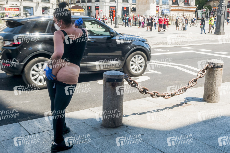 Prostituerte Andrea protestiert vor dem Reierungssitz Comunidad de Madrid auf der Puerta del Sol gegen die Maßnahmen aufgrund Coronakrise, Angesichts des Mangels an Kunden und der Schließung der Clubs, sagt sie, dass sie hungern muss. Madrid, 23.05.2020