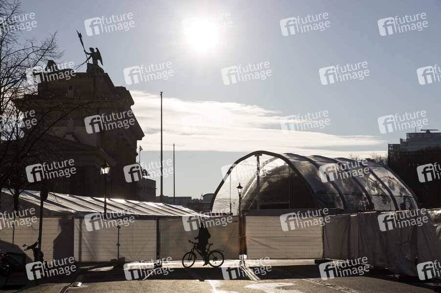 Vorbereitungen und Absperrungen zur jährlichen Silvesterfeier am Brandenburger Tor. Aufgrund der COVID-19-Abstandsregeln findet die Feier dieses Jahr nur als Fernsehübertragung ohne Livepublikum statt. Berlin, 30.12.2020