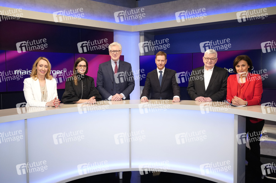 Melanie Amann, Iris Sayram, Theo Koll, Michael Kretschmer, Joschka Fischer und Sandra Maischberger in der ARD-Talkshow 'maischberger' im Studio Berlin Adlershof. Berlin, 12.03.2025