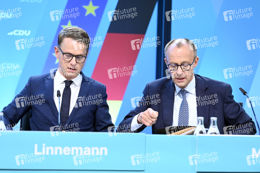 Carsten Linnemann und Friedrich Merz bei der Tagung vom Bundesausschuss der CDU Deutschlands im Estrel Berlin. Berlin, 28.04.2025