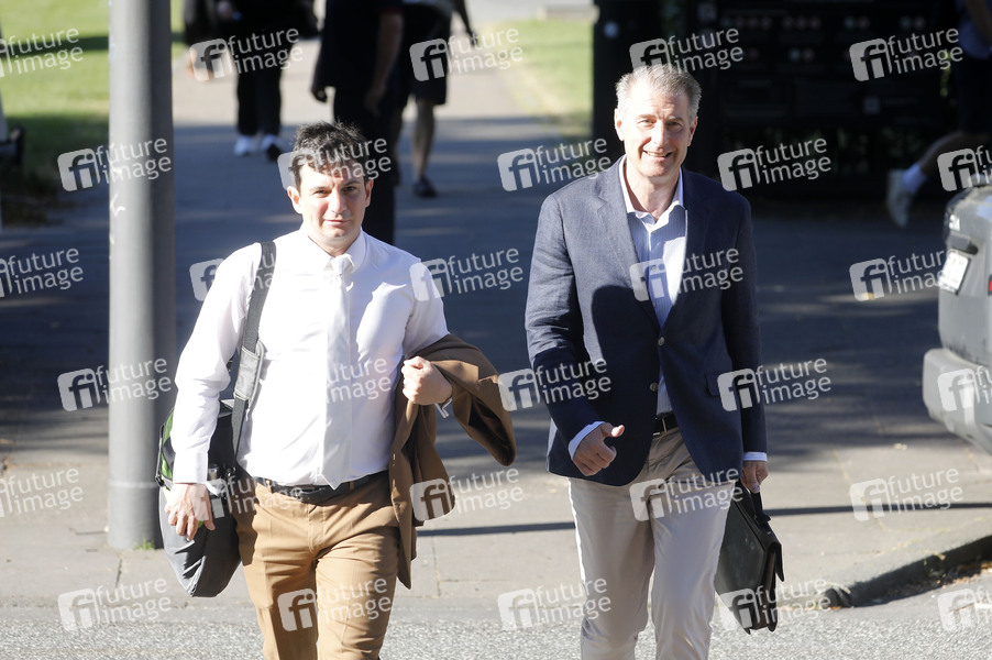 Stephan Hensel, Ex-Ehemann und Vater der Kinder von Christina Block, mit seinem Anwalt Philip von der Meden bei der Ankunft zum Prozess wegen mutmaßlicher Kindesentführung gegen Christina Block am Landgericht Hamburg. Hamburg, 19.08.2025