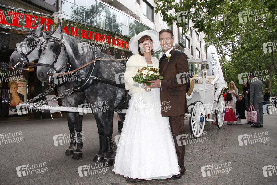 Das Brautpaar Jacques Breuer und Viola Wedekind mit der Hochzeitskutsche unterwegs vom Theater am Kurfürstendamm zur Hochzeitsfeier im Hotel Seehof