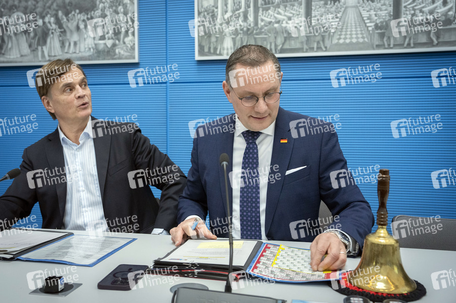 Bernd Baumann und Tino Chrupalla beim Pressestatement zur Fraktionssitzung der AfD-Bundestagsfraktion im Reichstagsgebäude. Berlin, 10.02.2025