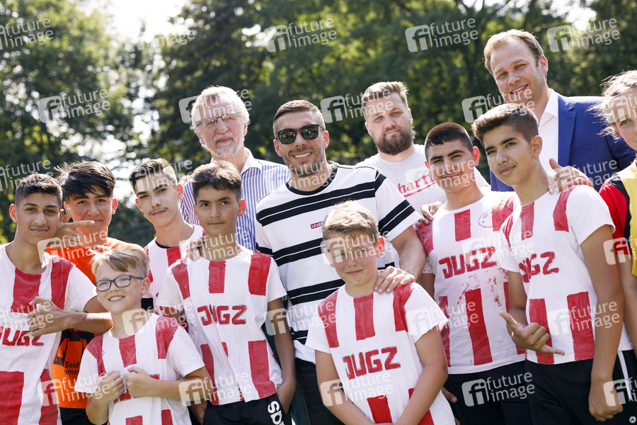 Andreas Hupke und Lukas Podolski mit Nachwuchsspielern bei der offiziellen Eröffnung des Bolzplatz 'Kuhle' am Römerpark, den die Stadt Köln mit finanzieller Unterstützung der Lukas-Podolski-Stiftung umgestaltet und modernisiert hat. Köln, 05.07.2019