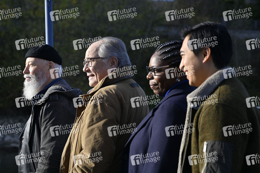 Bill Mockridge, Hartmut Volle, Aminata Müller und Aaron Le beim Fototermin am Set der ARD TV-Serie 'Rentnercops' am Bootshaus Albatros. Köln, 15.11.2022