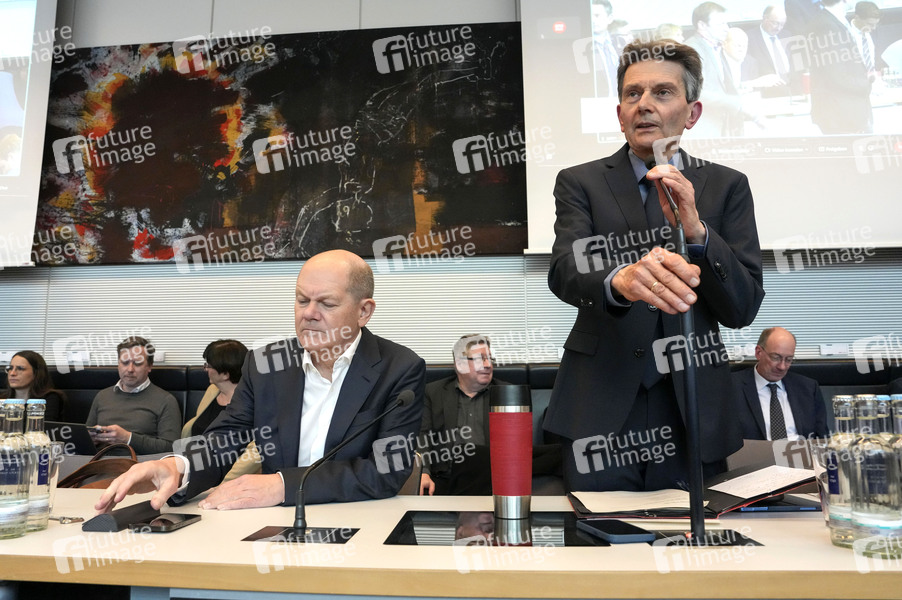 Olaf Scholz und Rolf Mützenich bei der Fraktionssitzung der SPD-Bundestagsfraktion im Reichstagsgebäude. Berlin, 12.03.2024