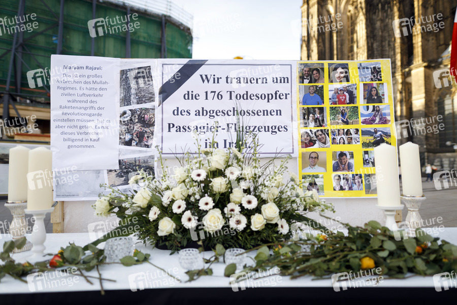 Mahnwache, Iran-Krieg, Iran-Konflikt, Exil-Perser, Exil-Iraner, Iran-Demo, Demo, Demonstration, Kundgebung, Gedenkfeier, iranische Opposition, Deutsch-Iraner, Regime-Change, Regierungswechsel, Flugzeugabschuss, Flugzeugabsturz, Revolutionsgarden, Hinrichtung, Hinrichtungen, Hinrichtungswelle, Todesstrafe, Gottesstaat, Mullah-Regime, iranische Flagge, Flagge des Iran, Hoheitszeichen des Iran in der Übergangszeit, deutsch-iranische Gesellschaft, Solidarität, Schweigeminute, Gedenken, Trauer, Symbolbild, Symbolfoto