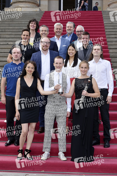 Emmanuel Pahud, Midori Seiler, Andreas Ottensamer, Konstantin Reinfeld, Benedikt Kristjansson, Friederike Roth, Kerstin Schüssler-Bach, Michael Becker, Clemens Trautmann, Guido Evers, Till Janczukowicz, Tobias Feilen und Burkhard Glashoff bei der Pressekonferenz zur Bekanntgabe der Preisträger des Opus Klassik 2019 im Konzerthaus Berlin. Berlin, 02.09.2019
