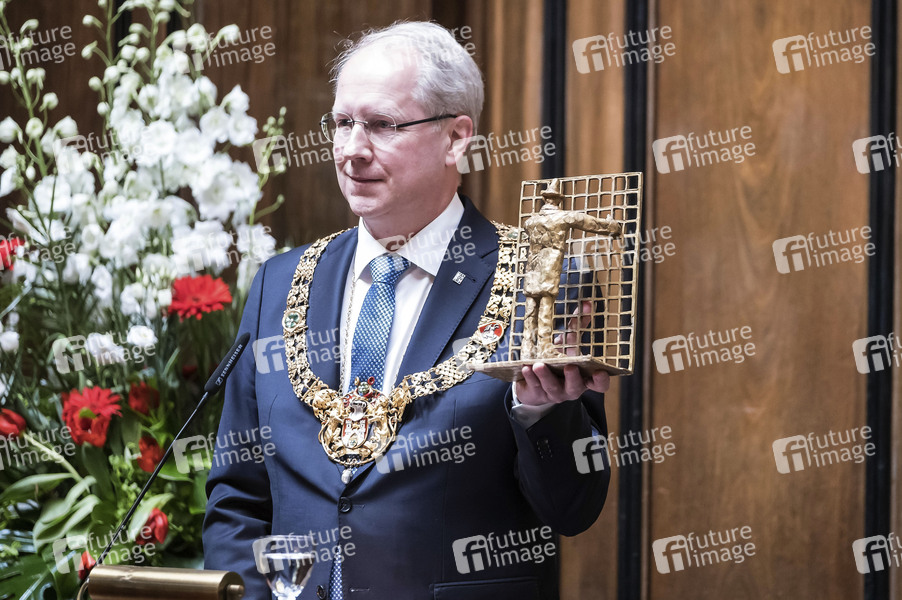 Stefan Schostok mit Bronzeplastik 'Ich will da rein' beim Empfang zum 75. Geburtstag von Ehrenbürger und Bundeskanzler a.D. Gerhard Schröder im Neuen Rathaus. Hannover, 24.04.2019