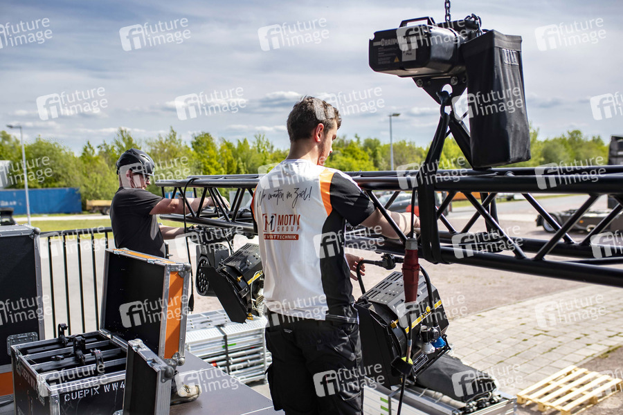 Die Bühne für die Autokonzert-Reihe an der Messe Erfurt wird aufgebaut. Die Eventreihe findet mit fünf Konzerten vom 20. bis 24. Mai 2020 statt. Erfurt, 18.05.2020