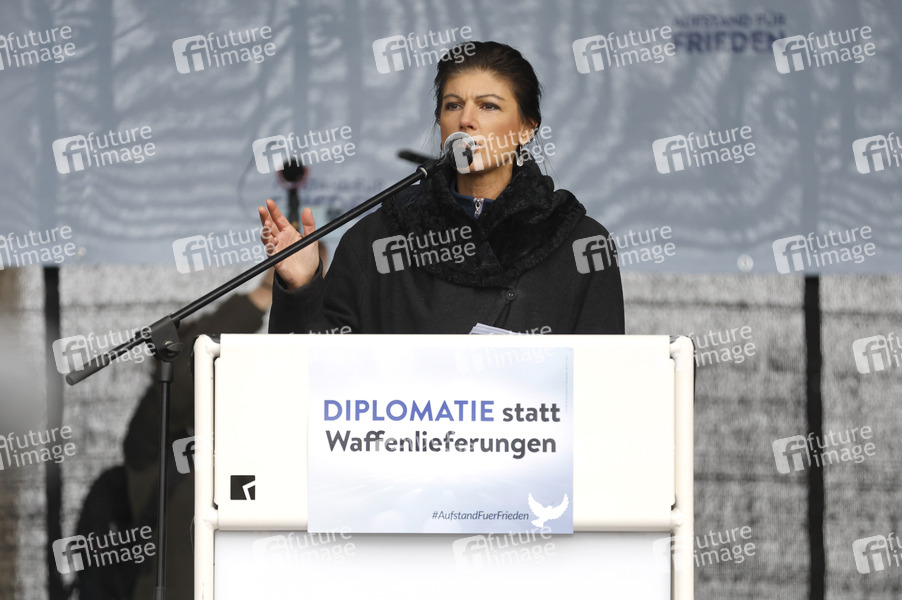 Sahra Wagenknecht spricht auf der umstrittenen Friedensdemo und Kundgebung für Verhandlungen mit Russland statt Waffenlieferungen für die Ukraine am Brandenburger Tor. Dazu aufgerufen haben die Linken-Politikerin Sahra Wagenknecht und die Frauenrechtlerin Alice Schwarzer. Berlin, 25.02.2023
