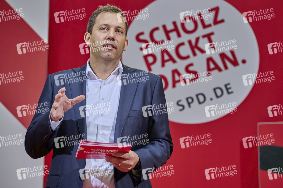 SPD-Generalsekretär und Wahlkampfmanager Lars Klingbeil präsentiert im Willy-Brandt-Haus den Wahlwerbespot für SPD-Kanzlerkandidat Olaf Scholz und die zweite Welle der Wahlplakate der SPD für die Bundestagswahl 2021. Berlin, 26.08.2021