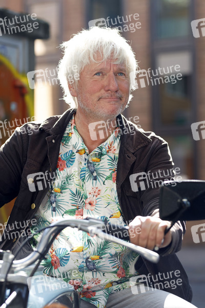 Jürgen Becker in einem Motorrad mit Beiwagen beim Fotocall zum WDR-Film 'Besuch aus dem Westen - Jürgen Becker unterwegs im Osten Deutschlands' im Mauritiussteinweg. Köln, 22.08.2019